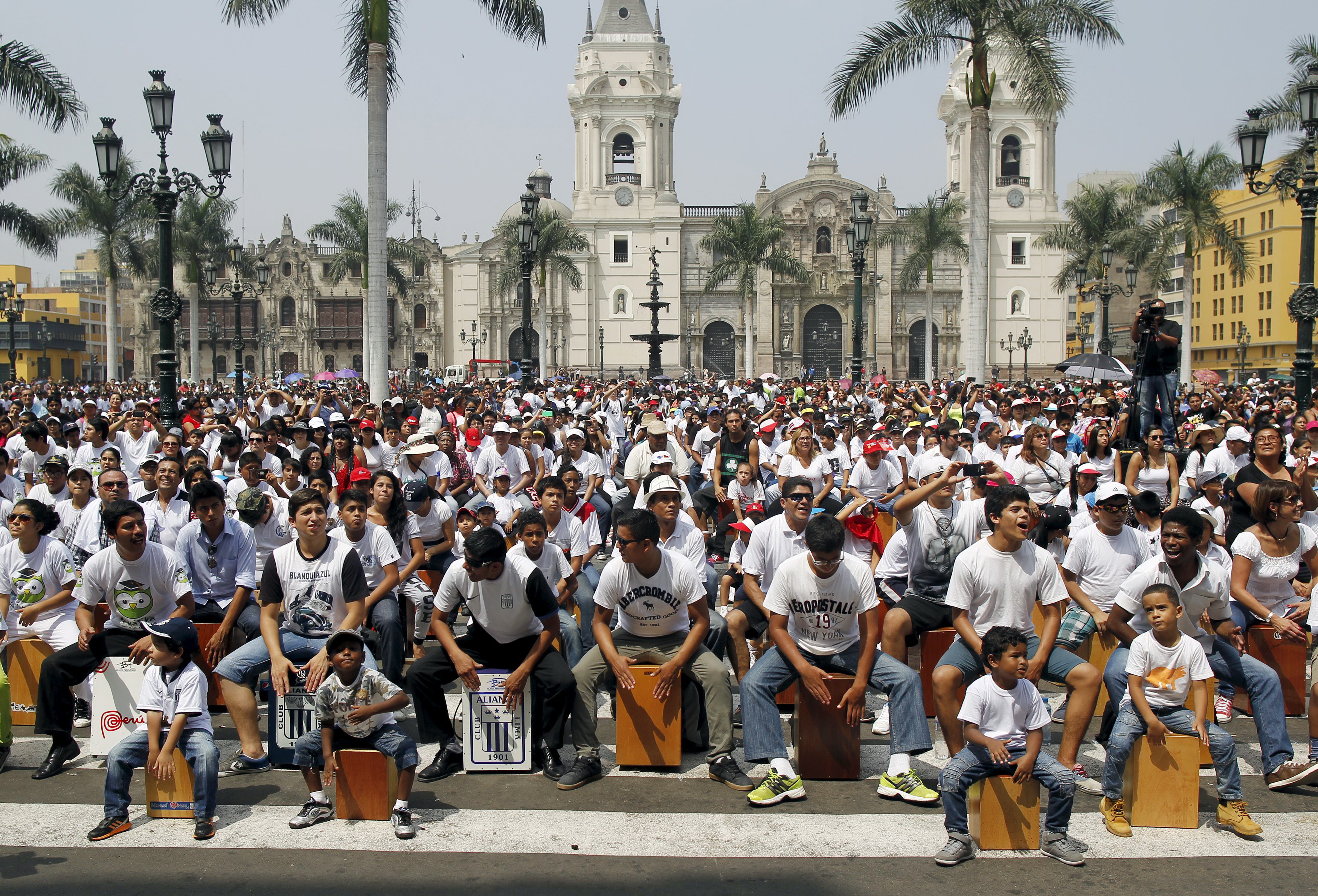 Participants play their cajones, a popular Peruvian instrument, during the 8th International Festival of the Peruvian Cajon in Lima's Plaza Mayor, April 25, 2015. Almost 2,000 people took part in the event playing the percussion instrument simultaneously, hoping to achieve a new world record for the world biggest cajon performance, according to organizers. REUTERS/Enrique Castro-Mendivil TPX IMAGES OF THE DAY