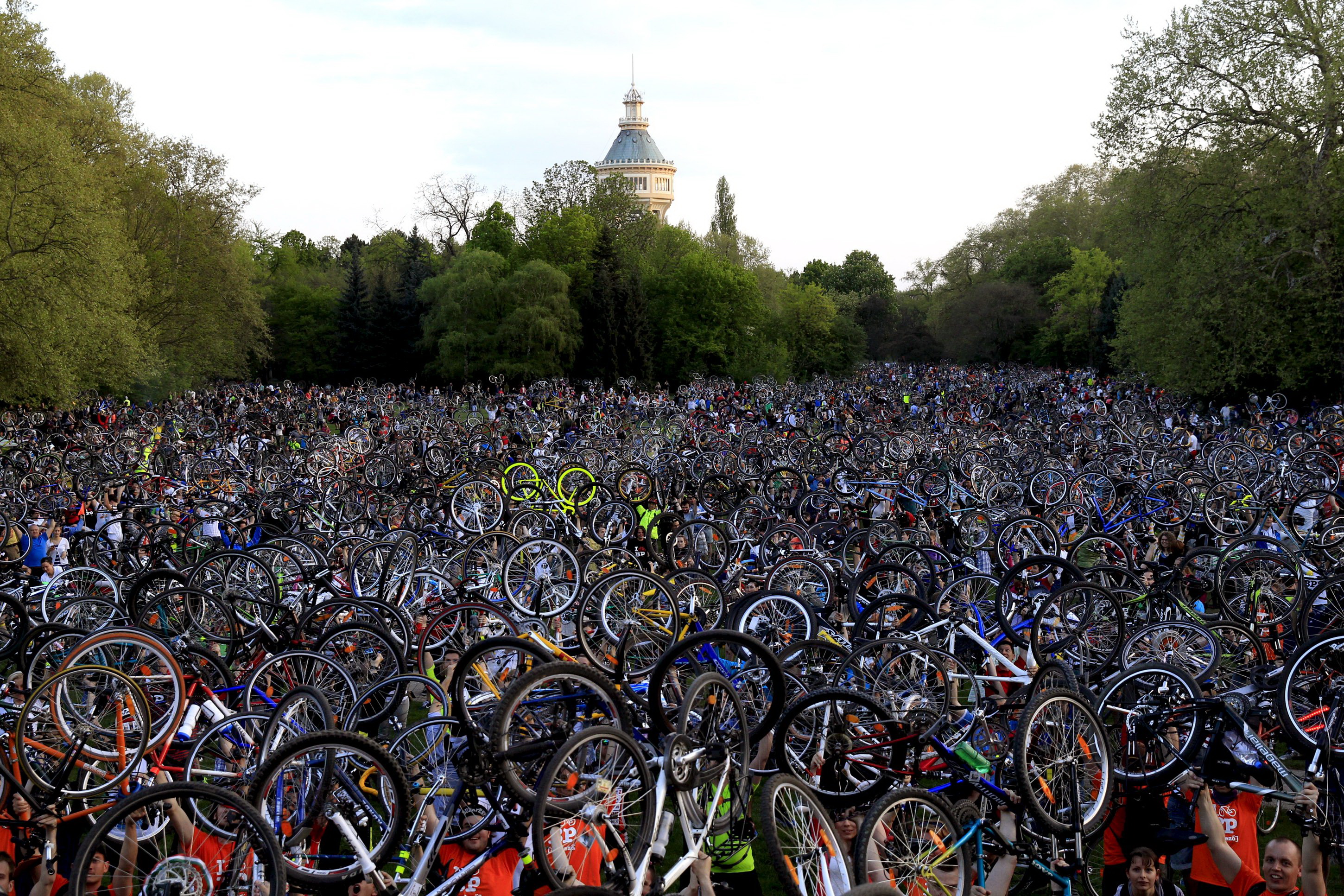 Thousands of cyclists hold up their bicycles after riding around the Hungarian capital Budapest on April 25, 2015, to demonstrate critical mass and demand that the city, where hundreds of thousands of people regularly use bikes to get around, develop more cycling infrastructure. REUTERS/Bernadett Szabo (HUNGARY - Tags: SPORT CYCLING SOCIETY) TPX IMAGES OF THE DAY
