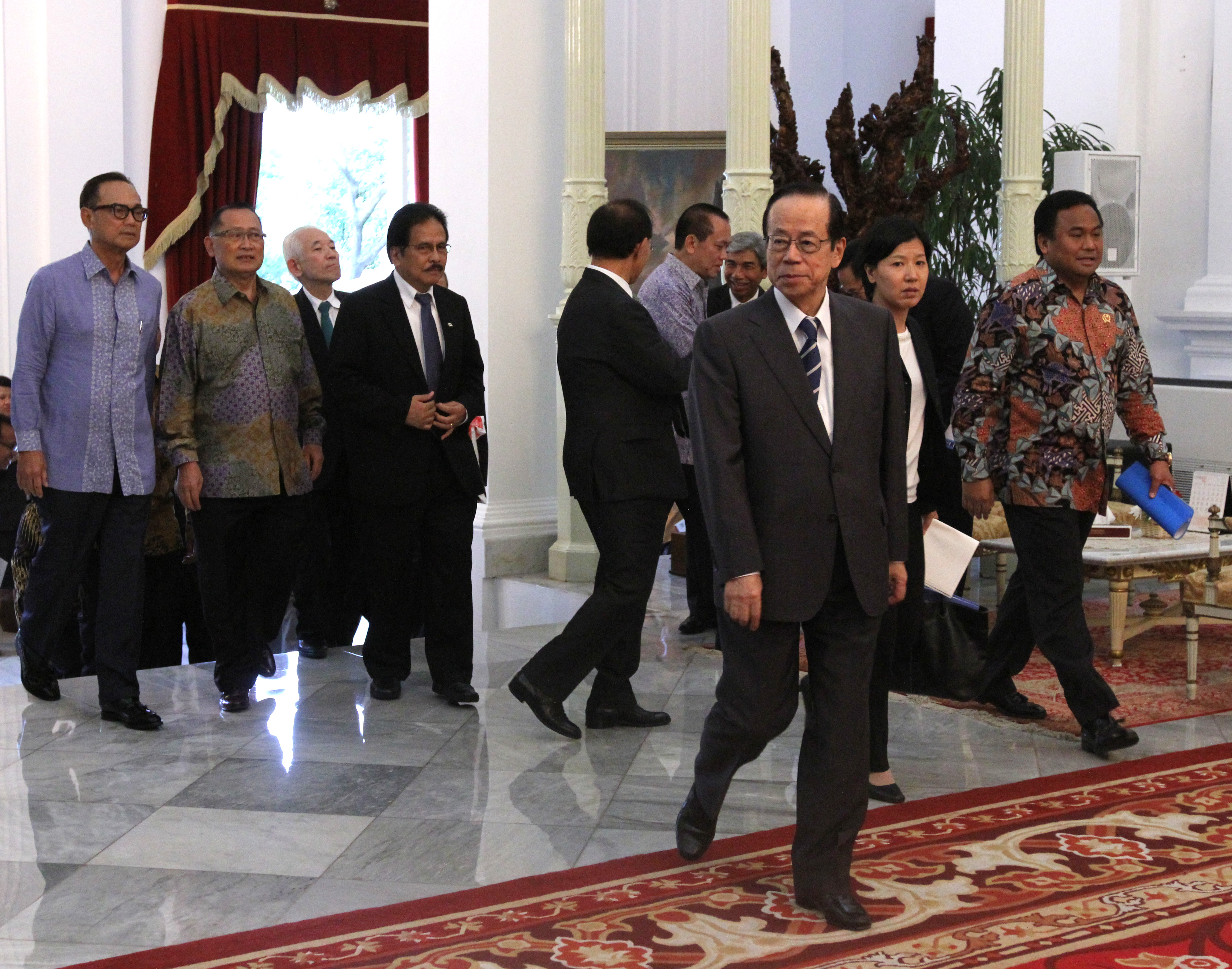 Mantan Perdana Menteri Jepang Yasuo Fukuda yang juga menjabat sebagai Presiden Asosiasi Jepang Indonesia Bertemu Dengan Presiden Joko Widodo Di Istana Merdeka