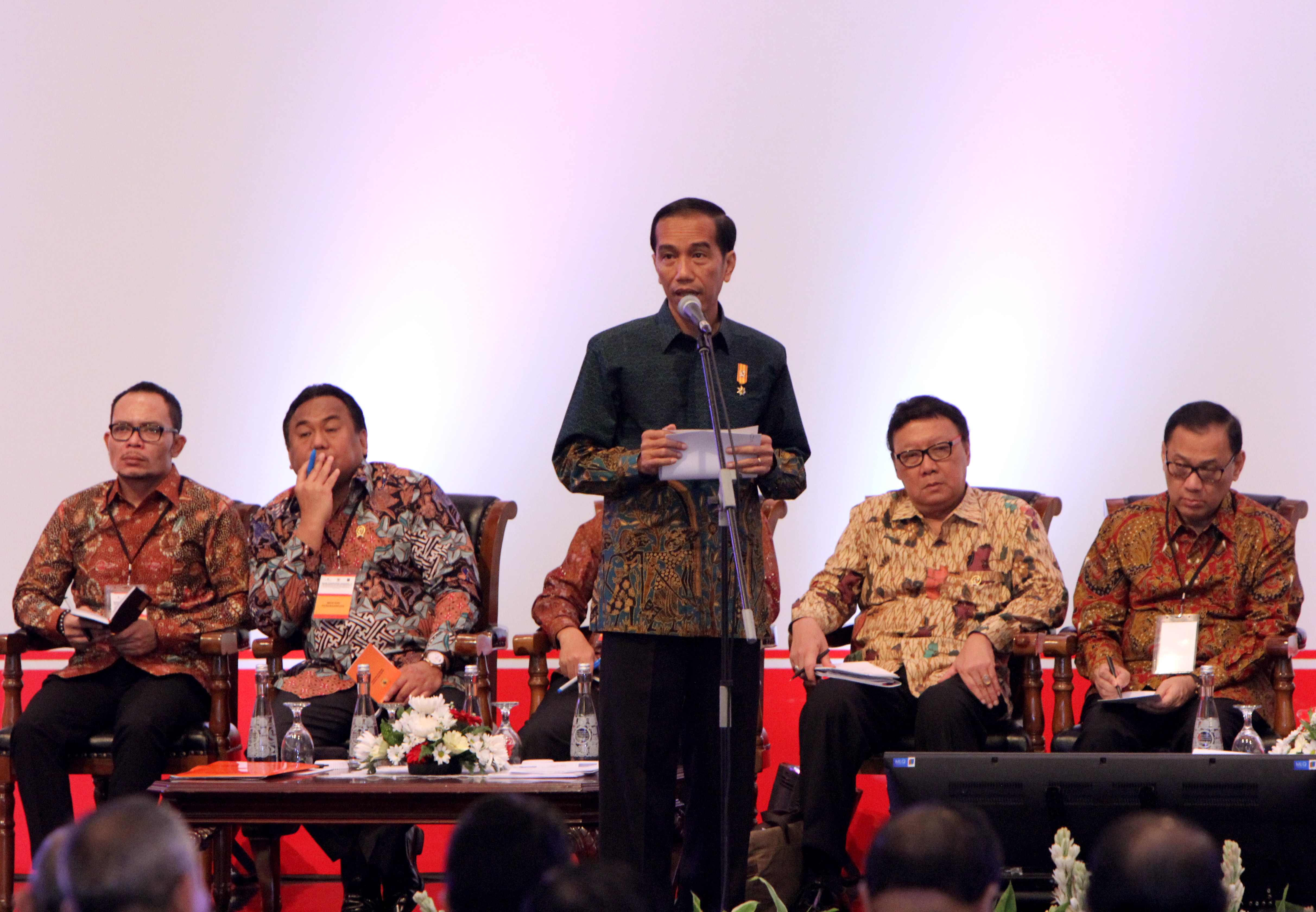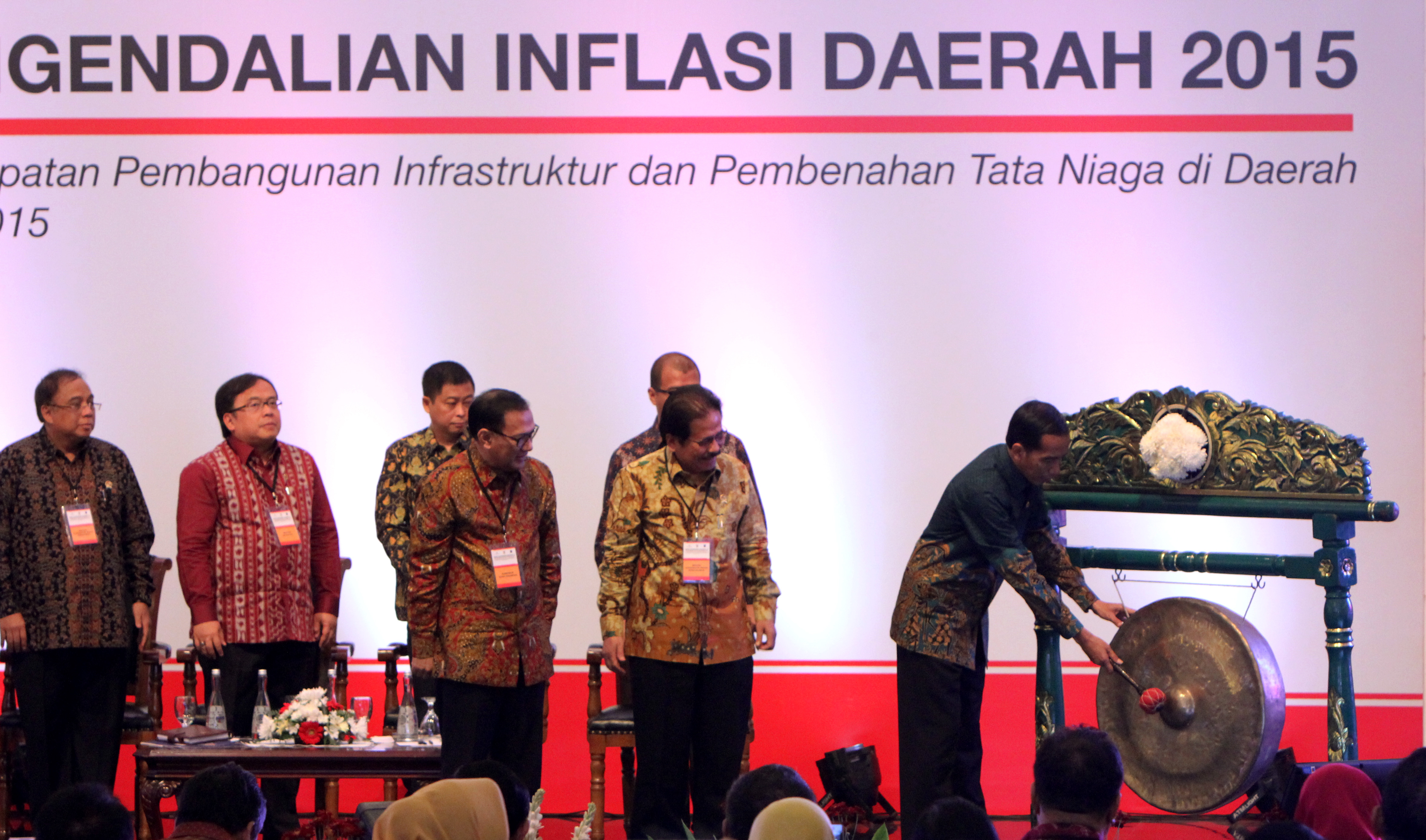 Pemukulan Gong Oleh Presiden Joko Widodo Saat Membuka Rakornas Ke VI Tim Pengendalian 2015 Di Sahid Jaya Hotel, 27 Mei 2015