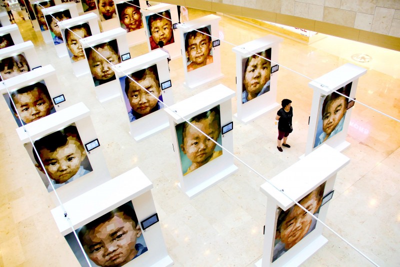 Seorang wanita berdiri di depan foto seorang anak hilang dalam pameran di lapangan Nianjing, provinsi Jiangsu, Rabu (10/6). Pameran tersebut menampilkan 61 foto anak hilang yang dilukis seniman Li Yueling dengan harapan lukisannya, bersama penggambaran melalui video dan tulisan, dapat meningkatkan kepedulian sosial atas masalah anak hilang di Tiongkok, menurut berita media setempat.