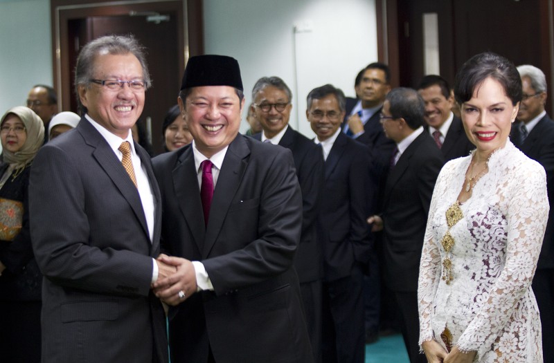 Deputi Gubernur Bank Indonesia (BI) Erwin Rijanto (tengah) didampingi Isteri Nila Permata (kanan) menerima ucapan selamat dari Mantan Deputi Gubernur BI Halim Alamsyah (kiri) usai mengikuti upacara sumpah jabatan di Jakarta, Rabu (17/8). Erwin Rijanto menggantikan jabatan Halim Alamsyah sebagai Deputi Gubernur BI untuk masa jabatan lima tahun berdasarkan Keputusan Presiden Nomor 39/P Tahun 2015.