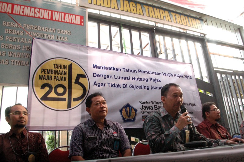 Kepala Kantor Wilayah Direktorat Jenderal Pajak Jawa Barat II Angin Prayitno Aji (kedua kanan), Kepala Lembaga Pemasyarakatan Bulak Kapal Waskito (kedua kiri) didampingi pihak kepolsian dan Kejaksaan Negeri Kota Bekasi memberi keterangan pers terkait persiapan lapas untuk menyandera penunggak pajak di Lapas Bulak Kapal, Bekasi, Jawa Barat, Jumat (19/6). Kanwil Ditjen Pajak Jawa Barat II akan melakukan pemaksaan badan atau penyanderaan (gijzeling) untuk memaksa para penunggak pajak melunasi tunggakan pajak yang akan dilakukan di Lapas Bulak Kapal, Bekasi.