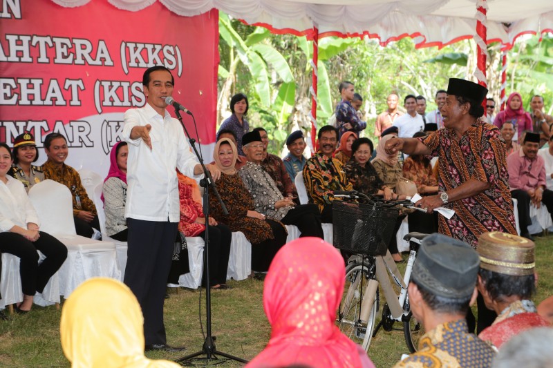 Presiden Joko Widodo berbincang dengan salah satu warga Kampung Sambau, Nongsa, Batam, Kepulauan Riau saat melakukan kunjungan kerja, Minggu (21/6). Dalam kesempatan tersebut Jokowi juga membagikan Kartu Indonesia Sehat (KIS), Kartu Keluarga Sejahtera (KKS), Kartu Indonesia Pintar (KIP) dan Kartu Asistensi Sosial untuk Penyandang Disabilitas Berat (ASPDB).