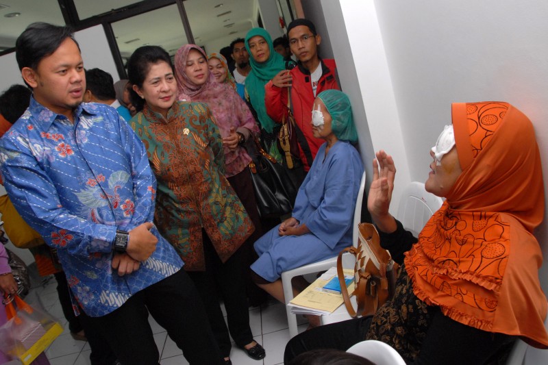 Menteri Kesehatan Nila F Moeloek (dua kiri) dan Walikota Bogor, Bima Arya (kiri) berbincang dengan pasien operasi katarak usai soft opening Cataracts Center & Pharcoemulsification Surgery di Klinik mata Hasri Ainun Habibie, Kota Bogor, Jabar, Minggu (21/6). Kegiatan yang didanai oleh PT Sido Muncul tersebut disamping melatih para dokter mata menggunakan teknik baru yaitu “Cataract with Phacoemulsification Surgery” juga memungkinkan untuk mengurangi tingkat kebutaan akibat katarak dimana saat ini penderita katarak di Indonesia berjumlah 1,5 persen dari jumlah penduduk atau sekitar 3 juta jiwa.