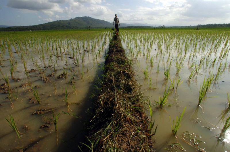 Petani mengecek areal pesawahan yang di air oleh pompanisasi akibat kesulitan air saat musim kemarau di Dusun Kertasari, Ciamis, Jawa Barat, Selasa (23/6). Menurut kelompok Tani Sri Rahayu, seluas 130 hektar areal pesawahan dikawasan tersebut menggunakan pompa air untuk mengairi sawahnya, sehingga petani harus menambah biaya produksi untuk menyewa mesin pompa air dengan 60 kilogram padi per hektar.