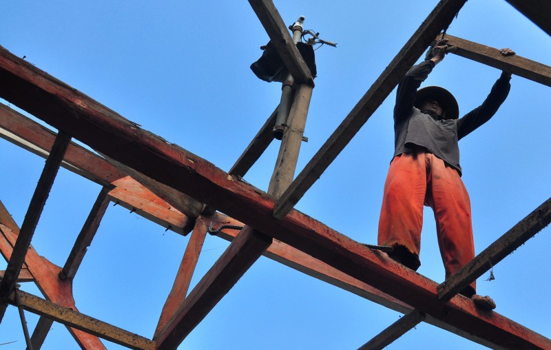 Pekerja membongkar atap rumah warga yang terkena proyek jalan tol Bawen-Solo di wilayah Pasaranyar, Kauman Kidul, Sidorejo, Salatiga, Jawa Tengah, Rabu (24/6). Sebanyak 156 bidang lahan di Kota Salatiga terkena proyek jalan tol Bawen-Solo yang memiliki ruas jalan 49,81 kilometer.