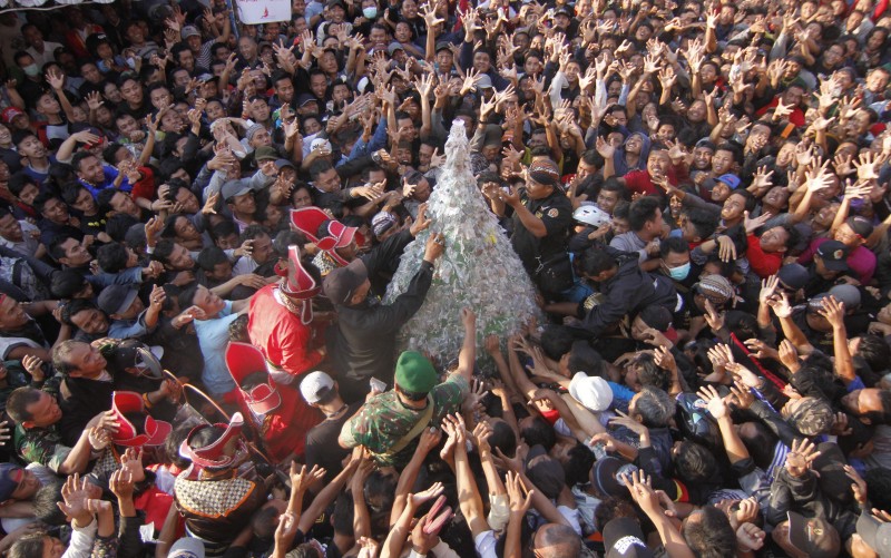 Ribuan warga berebut batu akik yang dipasang pada sebuah gunungan di Yogyakarta, Kamis (25/6). Terdapat 2.000 lebih batu akik sudah digosok maupun masih bentuk bahan mentah yang merupakan batu hasil donasi berbagai pihak, batu-batu tersebut dikirab lalu diperebutkan dengan bebas oleh masyarakat Yogyakarta.