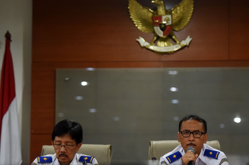 Direktur Kelaikan Udara dan Pengoperasian Pesawat Udara Kemenhub Muzaffar Ismail (kanan) didampingi Kapuskom Kemenhub JA Barata memberi keterangan terkait keberhasilan sejumlah maskapai Indonesia lolos izin terbang ke Uni Eropa di Kantor Kemenhub, Jakarta, Senin (29/6). Lima maskapai nasional yakni Garuda Indonesia, Indonesia Air Asia, Ekspres Transportasi Antar Benua (Premiair), Airfast Indonesia dan Mandala Airlines (Tigerair Mandala) lolos dari daftar hitam larangan terbang Uni Eropa karena telah lulus audit dari Komite Keselamatan Udara Uni Eropa.