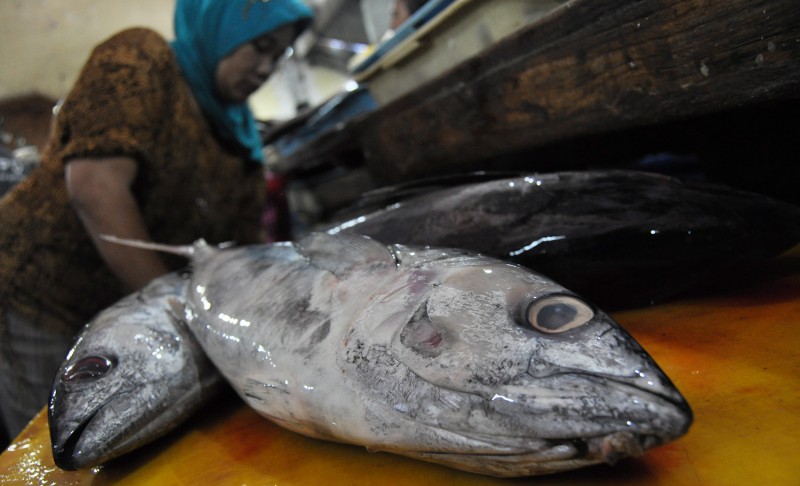 Pedagang menata ikan tongkol di pasar ikan di Surabaya, Jawa Timur, Senin (29/6). Harga ikan khususnya ikan tongkol di pasar tersebut mengalami kenaikan dari Rp20.000 per kg menjadi Rp24.000 per kg. Kenaikan harga tersebut disebabkan kurangnya pasokan dari nelayan.