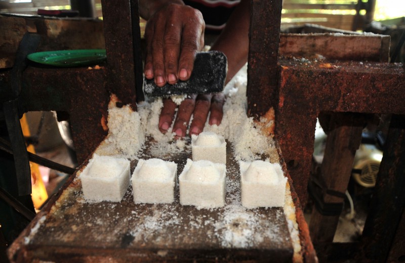 Pekerja mencetak garam di pengolahan industri garam Desa Kaliwlingi, Brebes, Jawa Tengah, Senin (29/6). Setiap pekerja di tempat pengolahan industri garam itu mampu mencetak 1500 kotak garam (62,5 kilogram) per jam untuk selanjutnya dipasarkan ke Tegal, Brebes dan Pemalang dengan harga Rp1600 per kg.