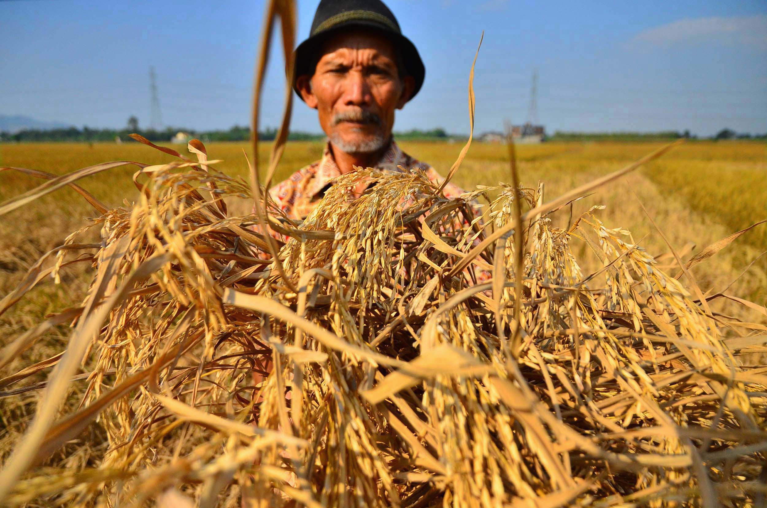 (Berita Daerah – Kudus) Petani menunjukkan tanaman padi yang sudah kering di Desa Hadiwarno, Jekulo, Kudus, Jawa Tengah, Selasa (30/6). Menurut Kepala Dinas Pertanian Perikanan dan Kehutanan ada sekitar 20 hektar tanaman padi di darah itu mengalami puso atau gagal panen karna kekurangan pasokan air.