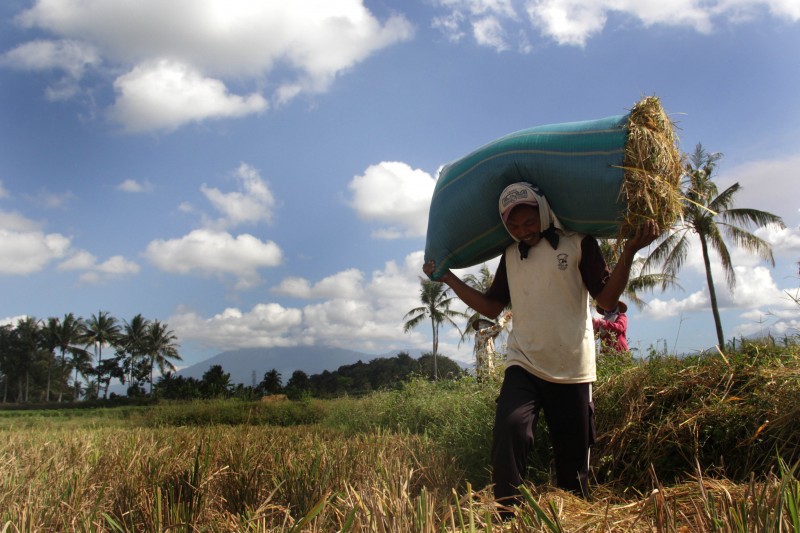Petani mengangkat gabah hasil panen di lereng Gunung Raung, Songgon, Banyuwangi, Jawa Timur, Selasa (7/7). Gunung Raung statusnya dinaikan dari waspada menjadi siaga sejak senin (29/6) namun demikian petani tidak terpengaruh status tersebut karena warga disekitar lereng Gunung Raung rata-rata berada diradius lebih dari 10 kilometer atau masih jauh dari yang di tetapkan radius aman 3 kilometer dari puncak gunung.
