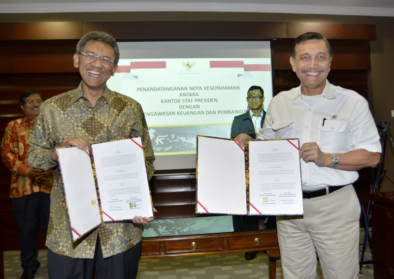 Kepala Staf Kepresidenan Luhut Pandjaitan (kanan) dan Kepala badan Pengawasan Keuangan dan Pembangunan (BPKP) Ardan Adi Perdana (kiri) menunjukkan naskah nota kesepahaman mengenai pengawasan program prioritas di Kantor Staf Kepresidenan, Jakarta, Jumat (10/7). Staf Kepresidenan dan BPKP bekerjasama dalam verifikasi lapangan terhadap program-program nawacita yang dicanangkan Presiden Joko Widodo dan kementerian dalam Kabinet Kerja.