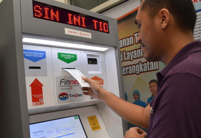 Calon penumpang melakukan transaksi penjualan tiket melalui mesin penjual tiket (E-Kios tiket) di Stasiun Kereta Api (KA) Madiun, Jawa Timur, Minggu (12/7). Stasiun KA Madiun merupakan salah satu stasiun yang dijadikan proyek percontohan untuk mengoperasikan mesin penjual tiket KA sehingga masyarakat tak perlu antre di depan loket.
