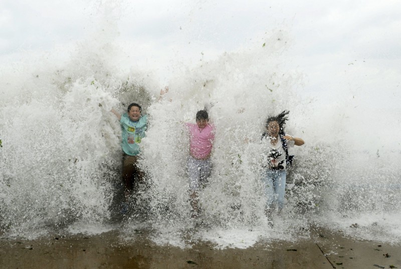Wisatawan berdiri dekat tepi laut tersambar ombak, yang melewati pembatas, dampak dari Topan Chan-hom di Qingdao, provinsi Shandong, Tiongkok, Minggu (12/7). Satu dari topan terkuat melanda wilayah timur Tiongkok dalam sepuluh tahun mengganggu transportasi darat, laut dan udara hari Sabtu lalu dan memaksa evakuasi sejuta penduduk di provinsi Zheijiang dan Jiangsu, menurut keterangan media nasional.