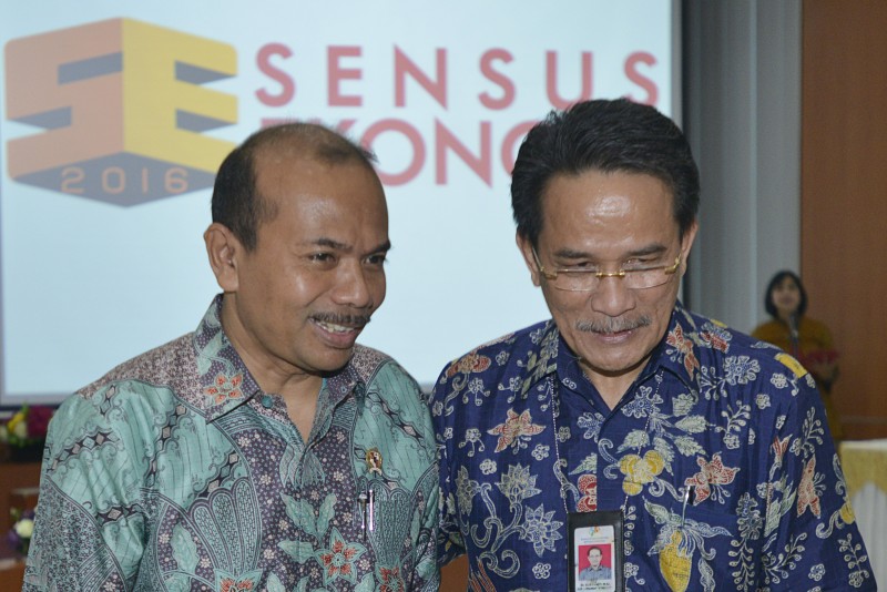 Menteri Perencanaan Pembangunan Nasional/Kepala Bappenas Andrinof Chaniago berbincang dengan dengan Kepala Badan Pusat Statistik Suryamin ketika peluncuran logo sensus ekonomi 2016 di Kantor BPS Jakarta, 8 Mei 2015. FOTO : BERITADAERAH.CO.ID/ELLEN