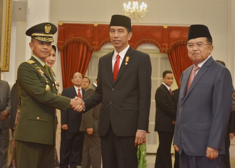 Presiden Joko Widodo (tengah) didampingi Wapres Jusuf Kalla (kanan) berjabat tangan dengan KSAD Letnan Jenderal TNI Mulyono usai pelantikannya di Istana Merdeka, Jakarta, Rabu (15/7). Letjen TNI Mulyono menggantikan KSAD sebelumnya Jenderal Gatot Nurmantyo yang menjabat Panglima TNI.