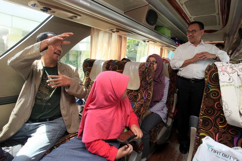 Menteri ESDM Sudirman Said (kanan) berbincang dengan calon pemudik di halaman kantor Kementerian ESDM, Jakarta, Rabu (15/7). Dalam menyambut lebaran 2015 Kementerian ESDM memberikan bantuan mudik gratis yang diikuti oleh 381 pemudik dengan menggunakan 19 bus dengan berbagai tujuan di pulau Jawa antara lain Solo, Yogjakarta dan Surabaya.