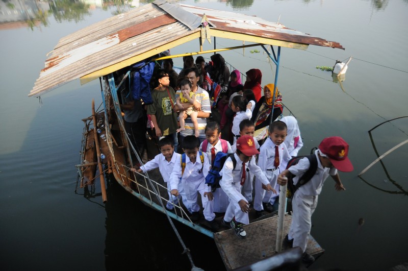 Sejumlah murid SDN Anyelir 2 berangkat menuju sekolahnya menggunakan perahu eretan di Situ Rawa Besar, Depok, Jawa Barat, Senin (27/7). Hari ini merupakan hari pertama masuk sekolah untuk tahun ajaran baru 2015/2016.