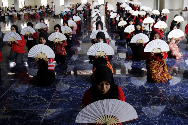 Sejumlah penari mengikuti latihan tarian massal di kampus Universitas Muhammadiyah (Unismuh) Makassar, Sulawesi Selatan, Minggu (26/7). Tarian massal yang diikuti 600 penari tersebut akan mementaskan tarian kolaborasi empat etnis Sulawesi Selatan Bugis, yaitu Makassar, Mandar dan Toraja, untuk memeriahkan pembukaan Muktamar ke-47 Muhammadiyah pada 3 Agustus 2015 mendatang.