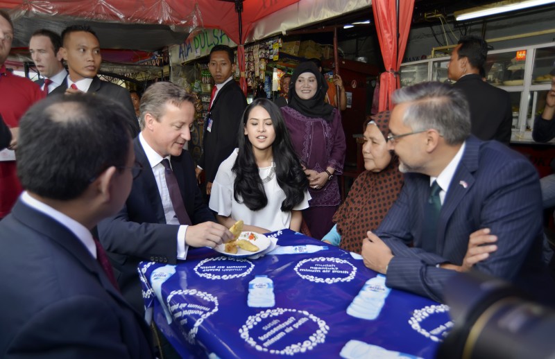 Perdana Menteri Inggris David Cameron (kedua kiri) didampingi Dubes Inggris untuk Indonesia Moazzam Malik (kanan) dan artis Maudy Ayunda (tengah) menikmati pisang goreng di warung halaman Masjid Agung Sunda Kelapa, Jakarta, Selasa (28/7). PM Inggris David Cameron mencoba jajanan dan makanan khas Indonesia sebelum bertemu dengan tokoh dan cendekiawan muslim di Masjid Agung Sunda Kelapa.