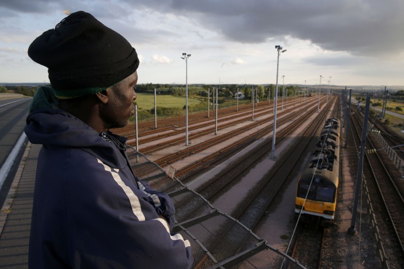 Seorang imigran dari Rwanda, menyebut dirinya Alex, usia 35 tahun dan ayah dari dua anak, berdiri di atas jembatan penyeberangan sambil melihat kereta di Calais, Perancis, Kamis (30/7). Kepada Reuters, ia mengatakan mencoba menyeberang terlalu membahayakan dan memutuskan mencari suaka di Perancis. Imigran lain yang berkumpul di sekitar pintu masuk Terowongan Channel mengatakan mereka akan tetap berupaya menuju Inggris, tidak takut dengan tibanya 120 personel polisi kerusuhan di sisi Perancis. Seorang petugas polisi mengatakan jumlah imigran yang memasuki Inggris berkurang semalam dibanding awal minggu, dengan 800 imigran di lokasi dan 300 lainnya dihalangi polisi.
