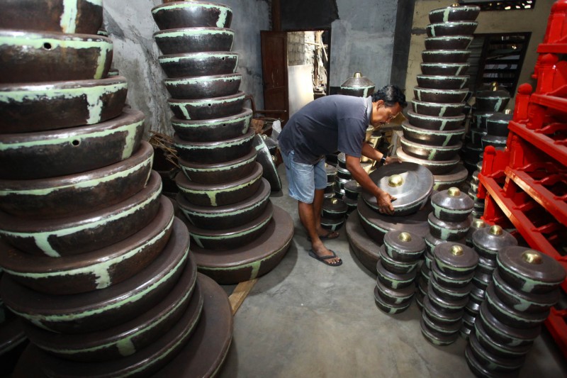 Perajin gamelan menata gamelan produksi industri gamelan rumahan “Daliyo Legiono”, Pelem Lor, Bantul, Yogyakarta, Selasa (4/8). Gamelan berbahan baku kuningan yang biasa dipasarkan ke sejumlah daerah di Indonesia dan diekspor ke Malaysia, Korea maupun Singapura itu dijual Rp. 60 juta- Rp. 250 juta per set tergantung model dan kualitas.