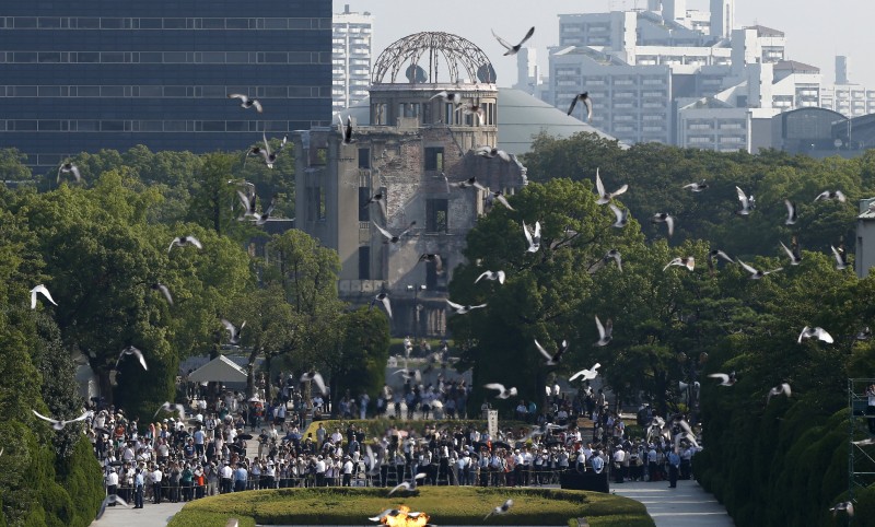 Merpati terbang melewati Taman Peringatan Perdamaian dengan latar belakang Kubah Bom Atom, saat upacara peringatan 70 tahun serangan bom atom di Hiroshima, Jepang, Kamis (6/8). Jepang memperingati serangan bom atom oleh Amerika Serikat pada 6 Agustus 1946 yang menewaskan 140.000 orang dari 350.000 warga kota hari ini. Kubah Bom Atom atau Genbaku Dome merupakan satu-satunya bangunan yang masih berdiri setelah serangan dan dilestarikan menjadi tugu peringatan.