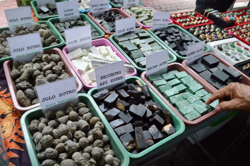 Pengunjung memilih batu akik di stan Pameran Nusantara Batu Akik dan Batu Mulia di halaman Pendapa Muda Graha, Madiun, Jawa Timur, Jumat (7/8). Pameran batu akik dan batu mulia selama empat hari tersebut diikuti kolektor dan penjual akik dan batu mulia dari berbagai kota antara lain dari Jawa Barat, Jawa Tengah dan Jatim.