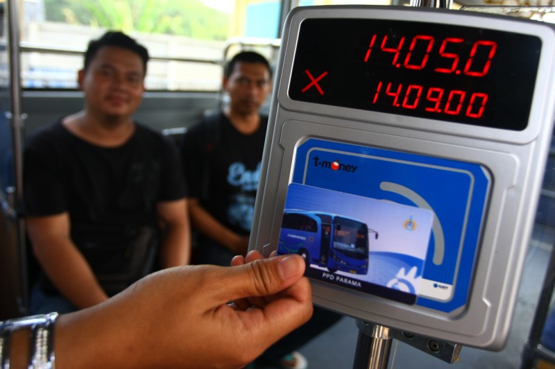 Penumpang menggesekan tiket elektronik pada mesin pembayaran e-ticketing yang ada di dalam bis Transjabodetabek Perum Pengangkutan Djakarta (PPD) saat dilakukan ujicoba pembayaran lewat sistem e-ticketing di terminal bis PPD Ciputat, Tangerang Selatan, Banten, Jumat (7/8). Perusahaan Pengangkutan Djakarta mulai melakukan pembayaran dengan sistem e-ticket yang tujuannya untuk mempermudah penumpang dan juga mencegah kebocoran pemasukan pembayaran dari penumpang.