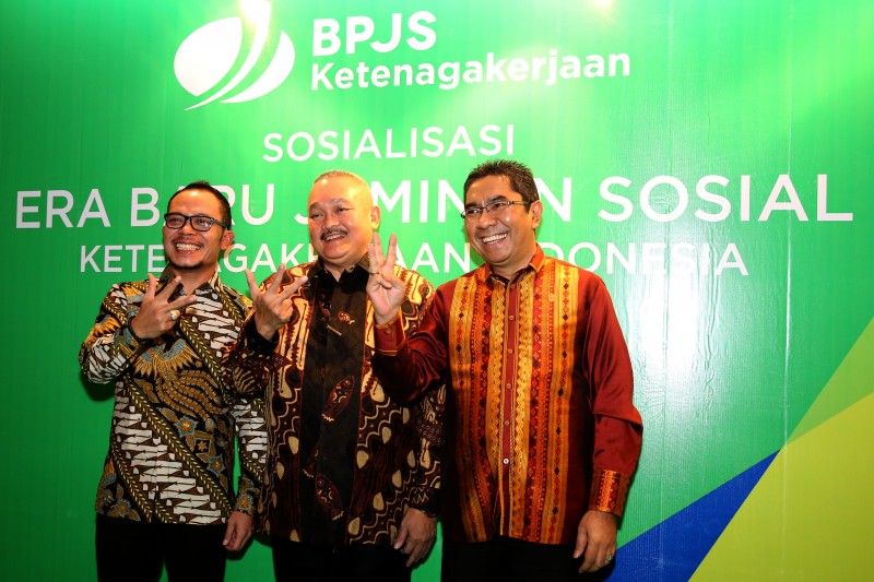 Menaker Hanif Dhakiri (kiri), Direktur Utama BPJS Ketenagakerjaan Elvyn G Masassya (kanan) dan Gubernur Sumsel Alex Noerdin (tengah) berfoto bersama saat menghadiri acara Sosialisasi Era Baru Jaminan Sosial Ketenagakerjaan Indonesia di Palembang, Sumsel. Senin (10/8) malam. BPJS Ketenagakerjaan mencatat dari 10 juta pekerja di Sumsel baru 15 persen yang terdaftar di BPJS Ketenagakerjaan.