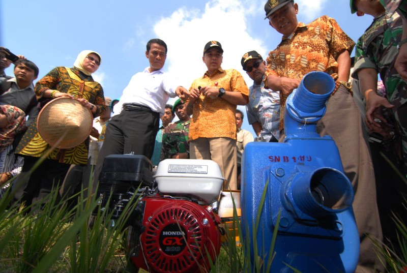 Menteri Pertanian Andi Amran Sulaiman (kedua kiri) didampingi Gubernur Banten Rano Karno (kedua kanan) dan Bupati Tangerang Zaki Iskandar (ketiga kiri) berbincang saat acara pemberian mesin pompa di daerah Ketapang, Mauk, Kabupaten Tangerang, Banten, Kamis (13/8). Untuk membantu meringankan beban petani saat sawah kekeringan Menteri Pertanian memberikan bantuan sebanyak 10 buah mesin pompa air diesel.