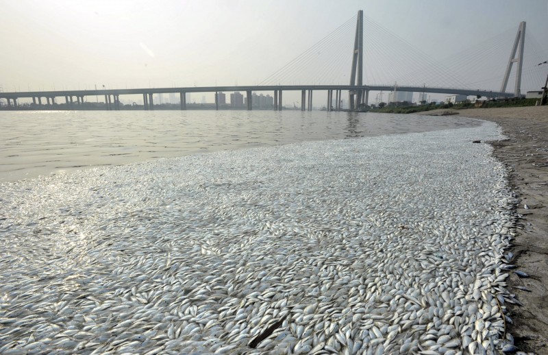 Ribuan ikan mati terlihat di tepi sungai Haihe, distrik Binhai, Tianjin, Tiongkok, Kamis (20/8). Namun kematian ikan ini bukan karena racun sianida seperti yang diperkirakan sebelumnya pasca terjadinya ledakan di daerah tersebut. Bangkai ikan ini terlihat di muara Sungai Haihe sekitar enam kilometer dari lokasi ledakan.
