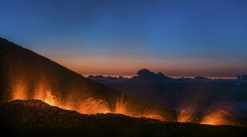 Lava cair menyembur dari Piton de la Fournaise, salah satu gunung api paling aktif di dunia, saat waktu fajar di pulau Reunion Samudera India wialyah Perancis, Selasa (25/8). Gunung Piton de la Fournaise mulai meletus hari Senin untuk keempat kalinya tahun ini, menyemburkan lava cair dari puncaknya.