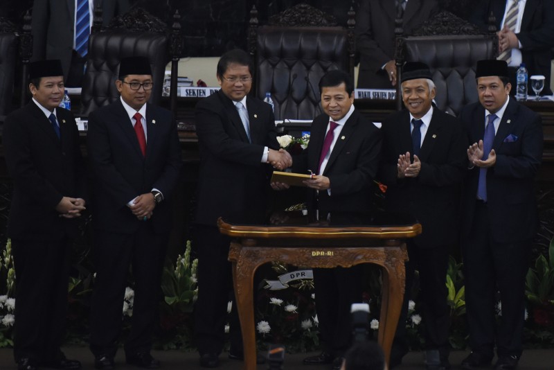 Ketua DPR Setya Novanto (ketiga kanan) menyerahkan perangko edisi HUT ke-70 DPR kepada Menteri Komunikasi dan Informatika Rudiantara (ketiga kiri) disaksikkan Wakil Ketua DPR Taufik Kurniawan (kiri), Fadli Zon (kedua kiri), Agus Hermanto (kedua kanan), dan Fahri Hamzah (kanan) saat peluncuran di Kompleks Parlemen Senayan, Jakarta, Jumat (28/8). PT Pos bekerja sama dengan DPR mengeluarkan perangkos edisi HUT DPR ke-70.