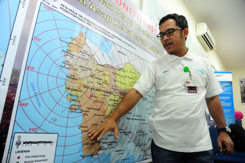 Koordinator Lapangan Teknologi Modifikasi Cuaca Badan Pusat Pengkajian dan Penerapan Teknologi (TMC-BPPT), Djazim Syaifullah menunjukkan peta kerja penanggulangan asap kebakaran dan lahan di Kalbar, di Posko Lanud Supadio, Kabupaten Kubu Raya, Kalbar, Senin (7/9). Djazim Syaifullah menyatakan bahwa terhitung sejak Agustus hingga 6 September 2015, TMC BPPT sudah melakukan 38 sorti penerbangan untuk menyemaikan garam di awan sebanyak 30.780 kilogram guna membuat hujan buatan di wilayah Kalbar yang sedang dilanda kabut asap.