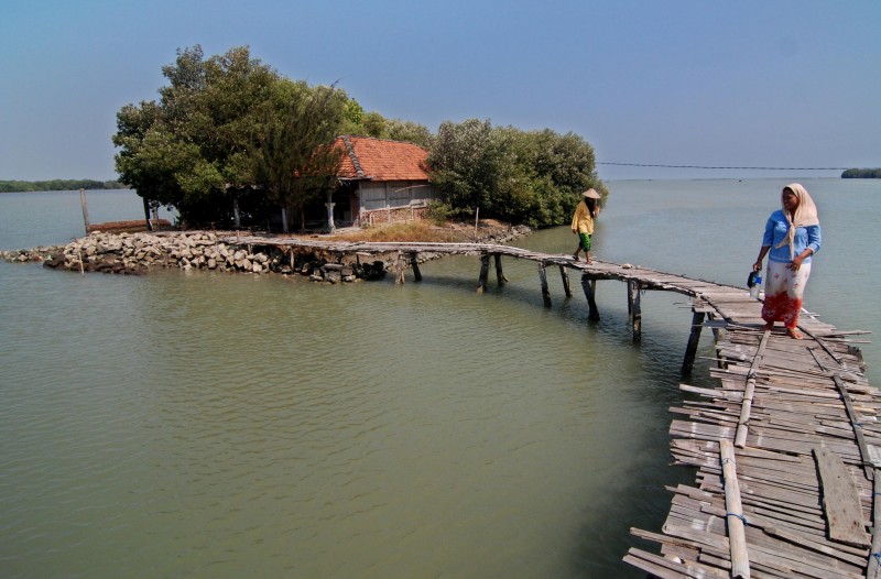 Warga beraktivitas di depan rumahnya yang terkepung air rob di Desa Bedono, Sayung, Kabupaten Demak, Jawa Tengah, Kamis (10/9). Selama sepuluh tahun terakhir ketinggian permukaan laut di pesisir setempat mengalami kenaikan hingga lima hingga sepuluh meter sehingga menyebabkan banyak rumah yang terendam dan memicu relokasi sebagian penduduknya karena rumahnya sudah tenggelam akibat abrasi pantai.