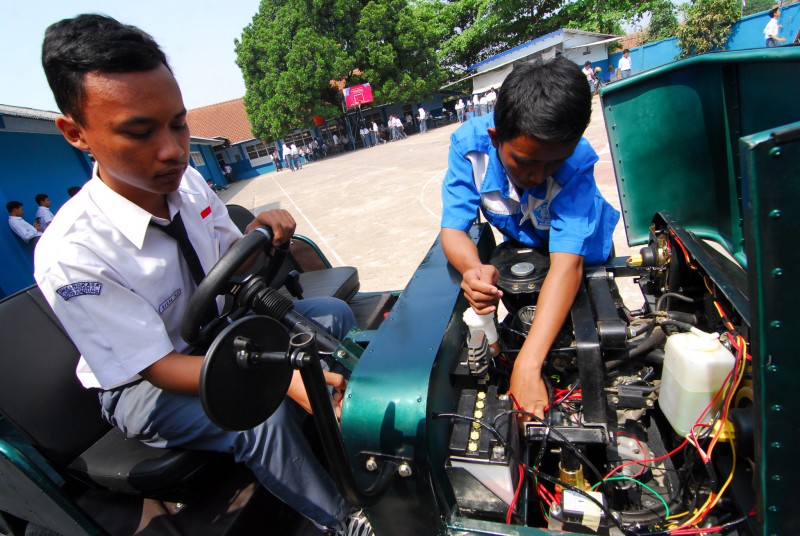 Dua pelajar memeriksa mesin mobil purwarupa yang diberi nama Sky Jeep V-150 i di halaman kampus SMK Angkasa Lanud Husein Bandung, Jawa Barat, Senin (14/9). Purwarupa Sky Jeep V-150 i merupakan hasil inovasi siswa SMK Angkasa dari mesin motor Yamaha Vixion 150 CC. Kendaraan ini mampu membawa beban sampai delapan orang dewasa dengan total pengerjaan selama empat bulan dan menghabiskan dana sebesar Rp43 juta.