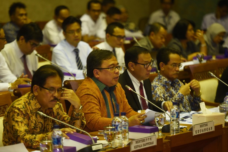 Menteri Keuangan Bambang Brodjonegoro (kedua kiri) bersama Menteri PPN/Kepala Bappenas Sofyan Djalil (kiri), Gubernur BI Agus Martowardojo (kedua kanan) dan Kepala BPS Suryamin (kanan), mengikuti rapat kerja dengan Komisi XI DPR di Kompleks Parlemen, Senayan, Jakarta, Senin (21/9). Rapat itu membahas asumsi dasar makro RAPBN 2016.