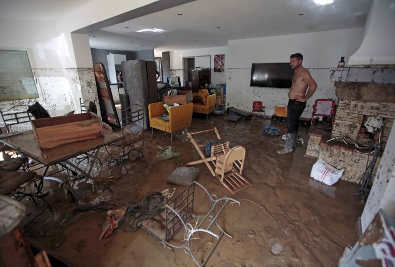 Seorang pria berdiri di tengah ruang tamunya yang dipenuhi lumpur akibat banjir yang disebabkan hujan lebat di Biot, Perancis, Minggu (4/10). Banjir di sepanjang Perancis Riviera merenggut 16 nyawa, menurut pihak berwenang. Hujan melanda wilayah Alpes-Maritimes, yang terletak di ujung utara pesisir Mediterania Perancis dan perbatasan Italia, Sabtu malam.