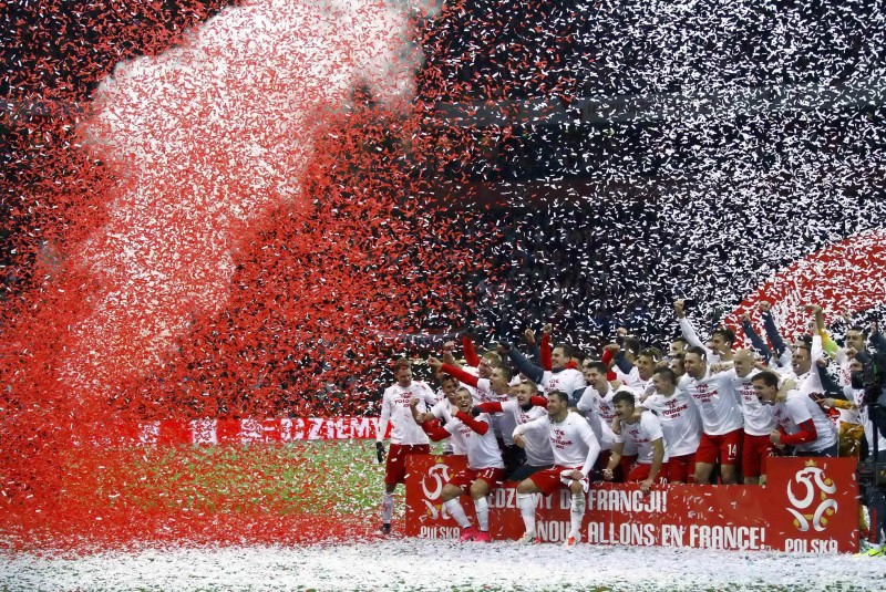 Pemain Polandia merayakan kemenangan usai menjuarai babak kualifikasi Piala Eropa 2016 Grup D melawan Republik Irlandia di Warsawa, Polandia, Minggu (11/10). Polandia memenangkan pertandingan dengan skor 2-1 untuk mendapat tempat di Piala Eropa 2016.