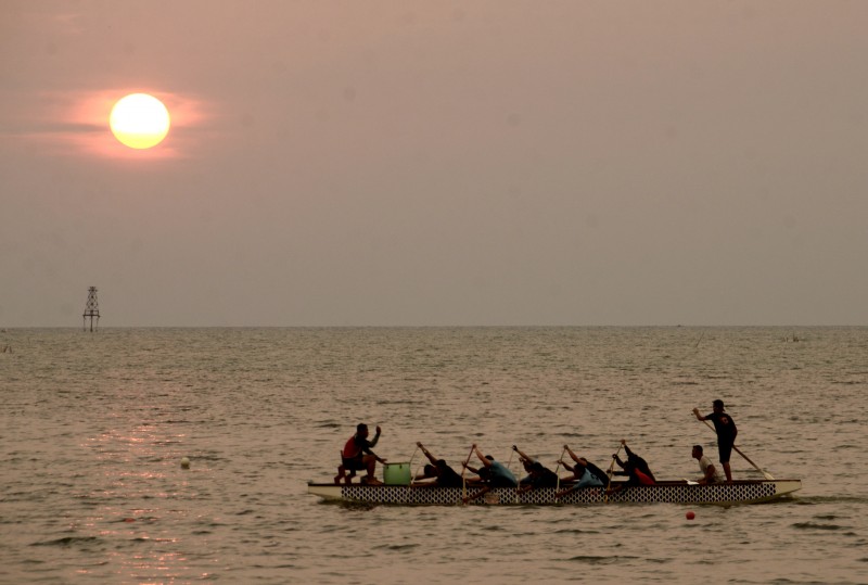 Atlet dayung melakukan latihan menjelang ajang International Dragon Boat Festival di Pantai Losari, Makassar, Sulawesi Selatan, Kamis (5/11). Festival Perahu Naga akan berlangsung pada 7-8 November 2015 di kawasan Pantai Losari diikuti enam negara, yakni Indonesia, Hongkong, Singapore, Malaysia, Iran, dan Filipina.
