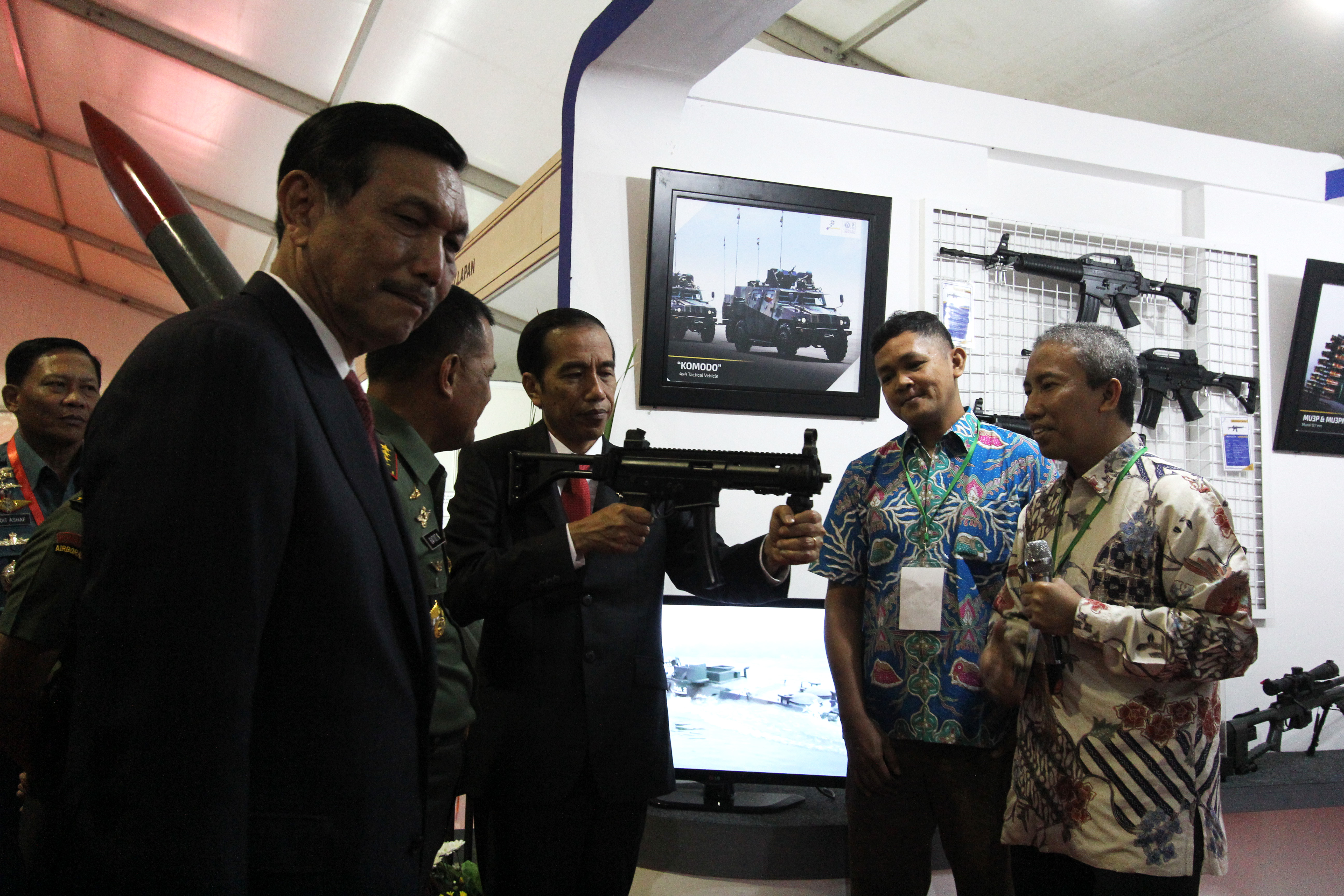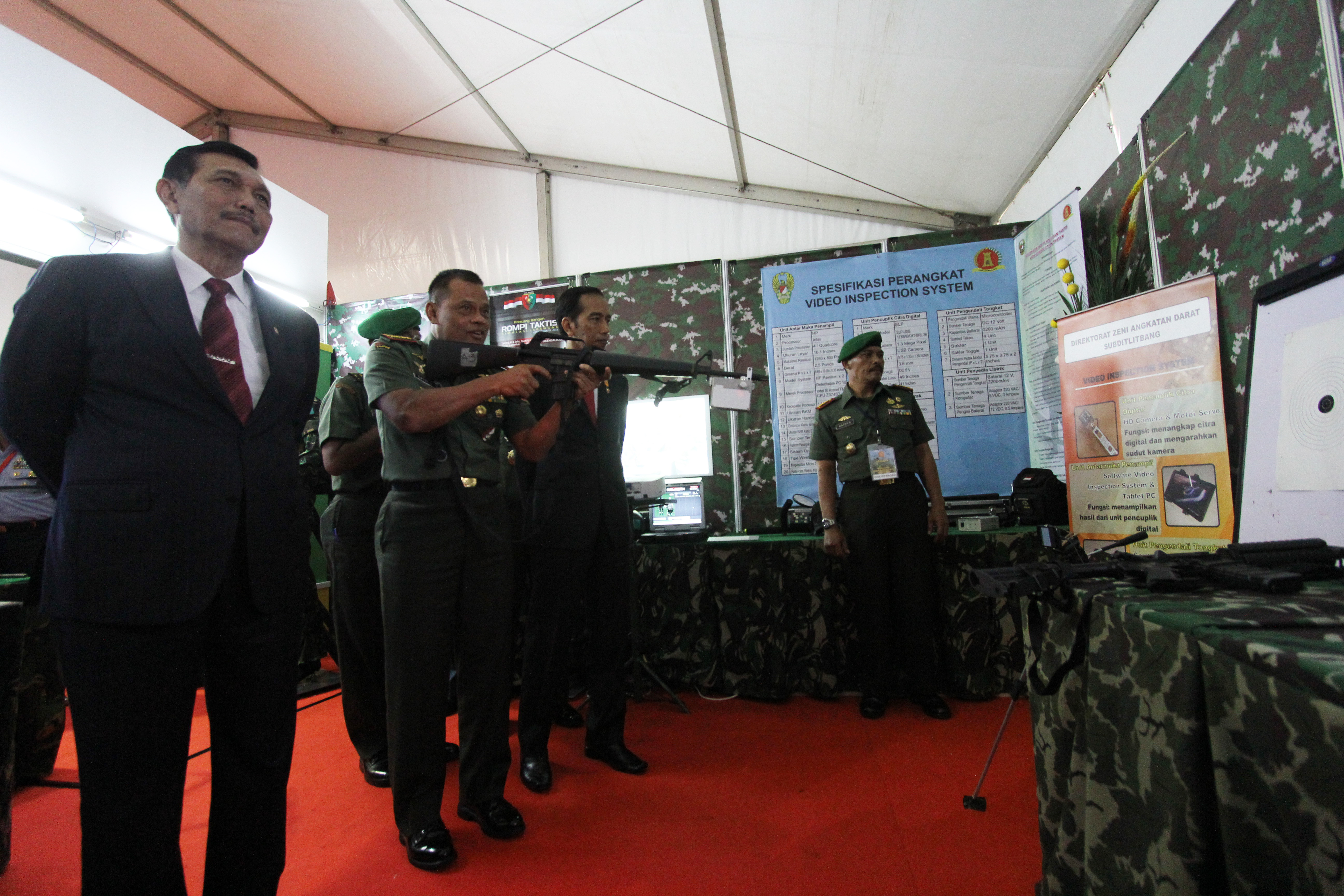 Presiden Joko Widodo Sedang Mencoba Senjata Api Buatan PT Pindad di Pameran Alutsista TNI Cilangkap. FOTO : VIBIZMEDIA.COM/RULLY