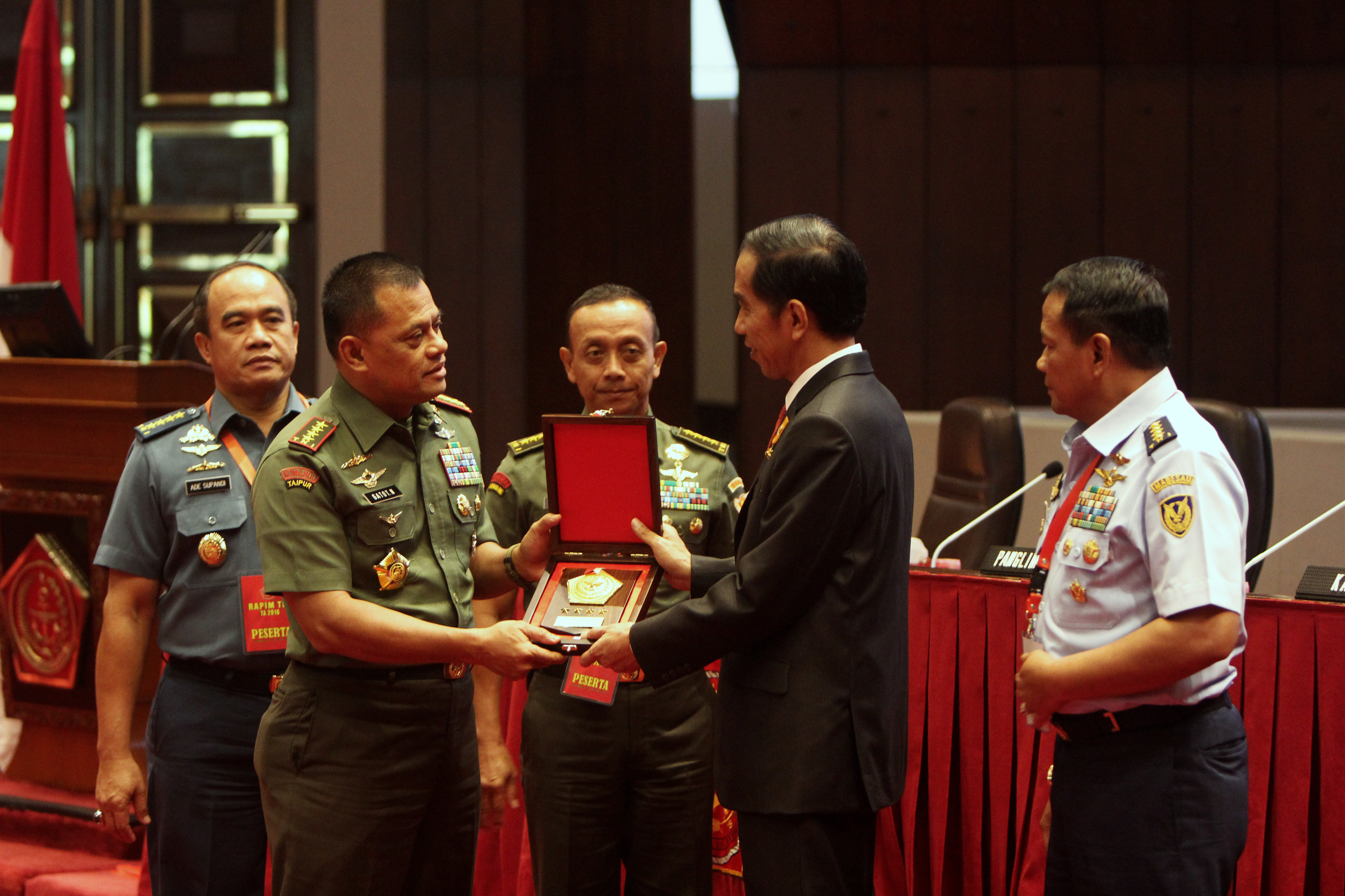 Presiden Joko Widodo Menerima Penghargaan dalam Rapat Pimpinan TNI Membahas Anggaran 2016 di Mabes TNI, Cilangkap. FOTO : VIBIZMEDIA.COM/RULLY