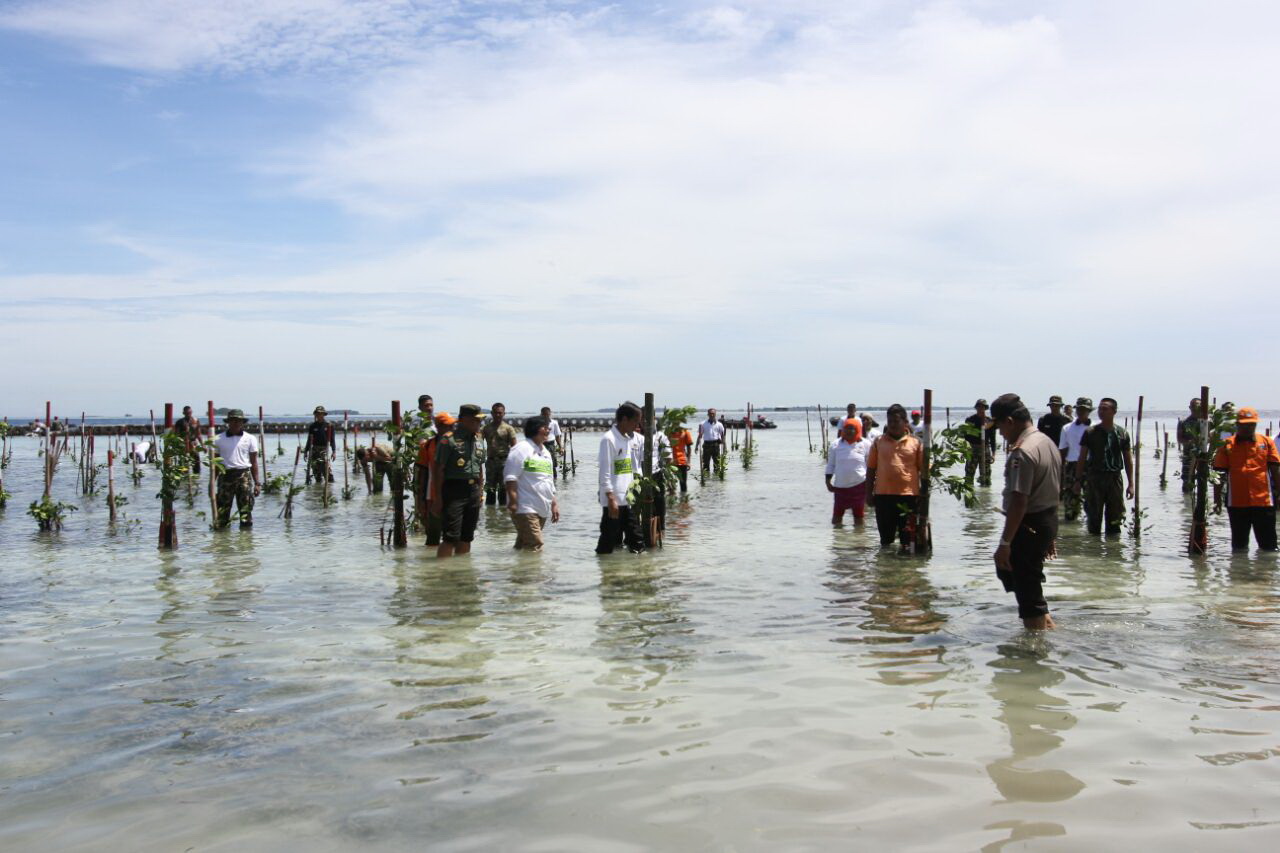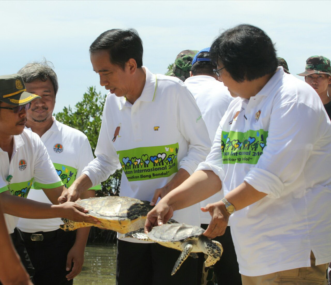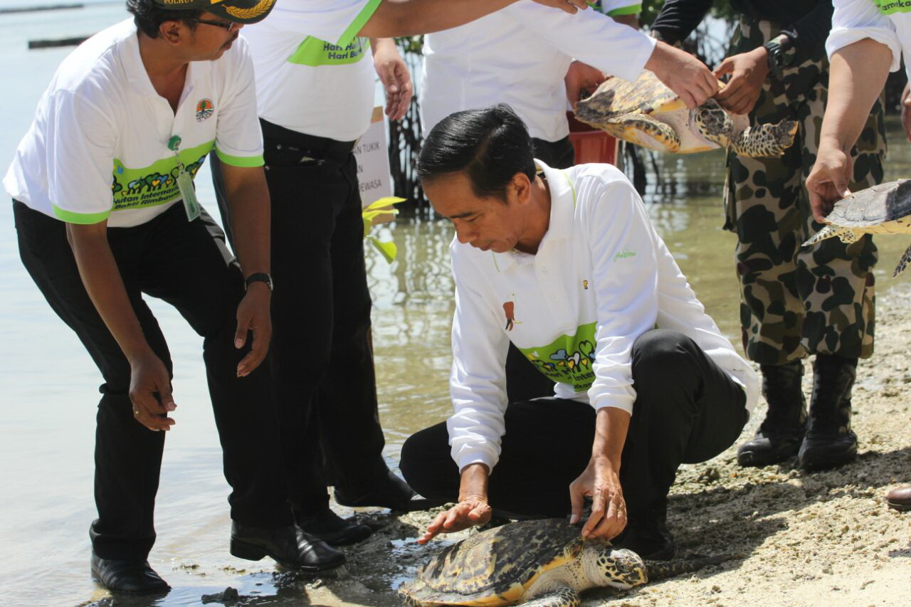 Presiden Joko Widodo dan Menteri Kehutanan dan Lingkungan Hidup Melepas 4 Penyu di Pulau Karya, Kepulauan Seribu. FOTO : VIBIZMEDIA.COM/RULLY