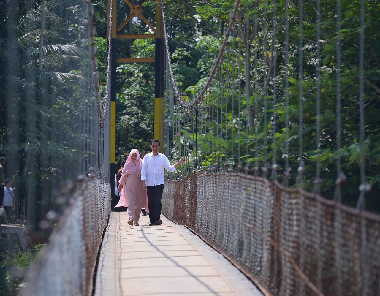 Presiden Joko Widodo dan Ibu Negara Iriana Jokowi melewati jembatan gantung di desa Kalang Anyar, Banten saat melakukan pembagian sembako jelang Idul Fitri. FOTO : SETPRES