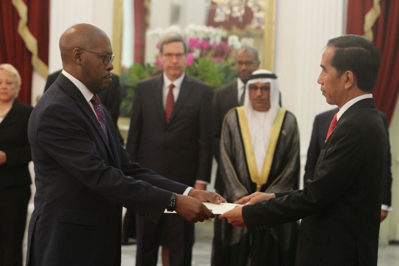 Duta besar LBBP Republik Namibia berkedudukan di Kuala Lumpur, Anne Namakau Mutelo menyerahkan surat kepercayaan kepada Presiden Joko Widodo di Istana Merdeka. FOTO : VIBIZMEDIA.COM/RULLY