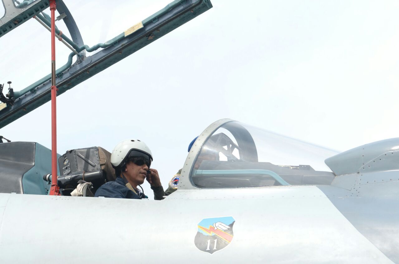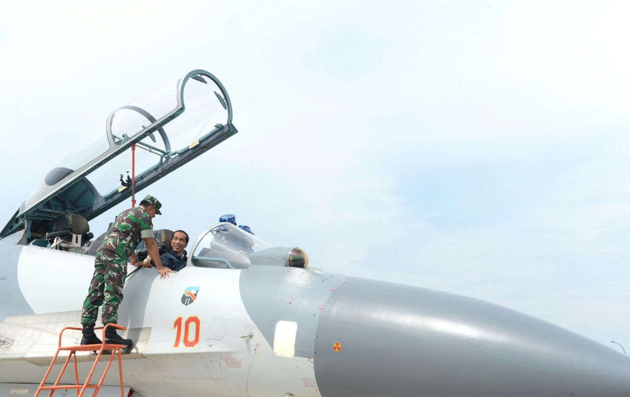 Presiden Joko Widodo meninjau langsung alutsista TNI AU dan berjalan kaki menuju lokasi parkir pesawat tempur Sukhoi Su-27atau 30 di Apron Bandar Udara Ranai. FOTO : SETPRES