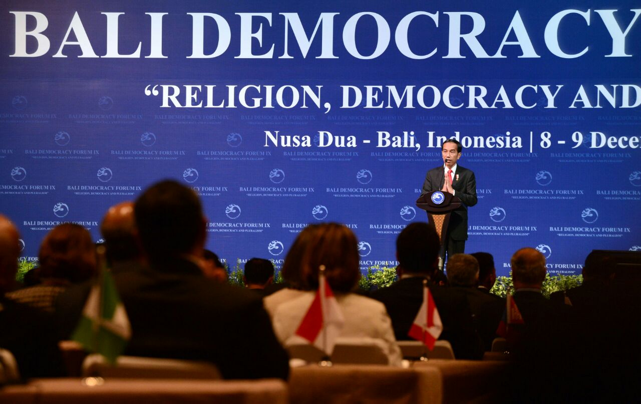Forum Demokrasi Bali yang mengangkat tema “Agama, Demokrasi, dan Toleransi ini, Presiden Joko Widodo meyakini bahwa agama tidaklah menjadi penghalang bagi terjalinnya demokrasi dan toleransi antarnegara dan sesama. Dirinya kemudian mencontohkan dengan kondisi nyata yang terjadi di Indonesia, negara dengan 1.300 etnik di mana 85% penduduknya ialah Muslim.